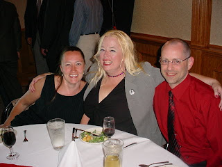My old kindergarten pals Cathy and Matthew and, below, Matthew, Matthew's partner Ray and myself. It was a blast, to use some appropriately 1980s slang - I was so glad I went. Everything good-spirited; saw old friends like David Oberg and Dean Carignan and the Wagoner Twins and Rob Innes, all of whom I've known since we were all 3 years old (!) - okay, I've only known Rob since we were 7 - and nearly all of whom are in the first picture, where we're looking at our kindergarten class picture. There's such a real warmth that connects you to people you've known that long - it was wonderful to feel that link after not seeing people for so many years.